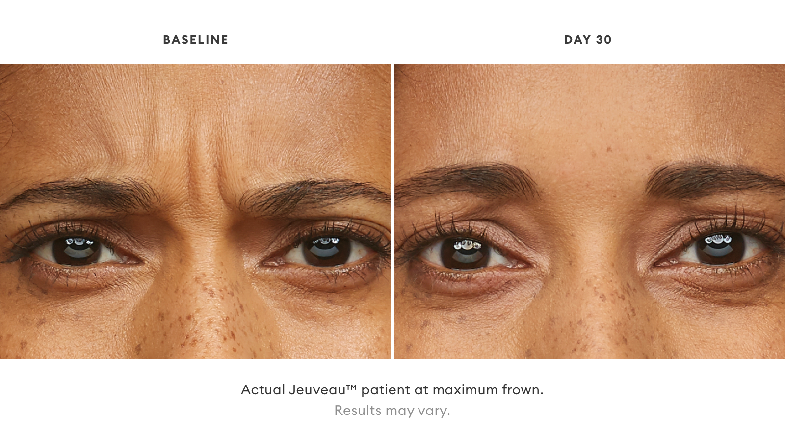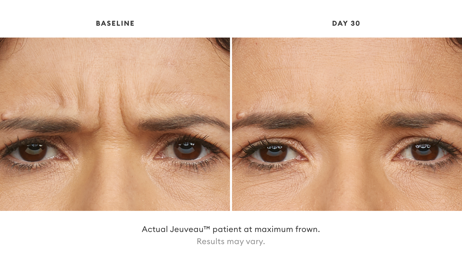Virtually anyone who believes that vertical lines between the eyebrows detract from their appearance is a good candidate for Jeuveau. It is approved by the FDA to treat these wrinkles (sometimes called “worry lines” or “the 11s”). Jeuveau can also be used to minimize crow’s feet at the corners of the eyes and horizontal forehead wrinkles. Because neurotoxins such as Jeuveau limit the muscle movements that produce these wrinkles, the injections can also help postpone the appearance of these lines.